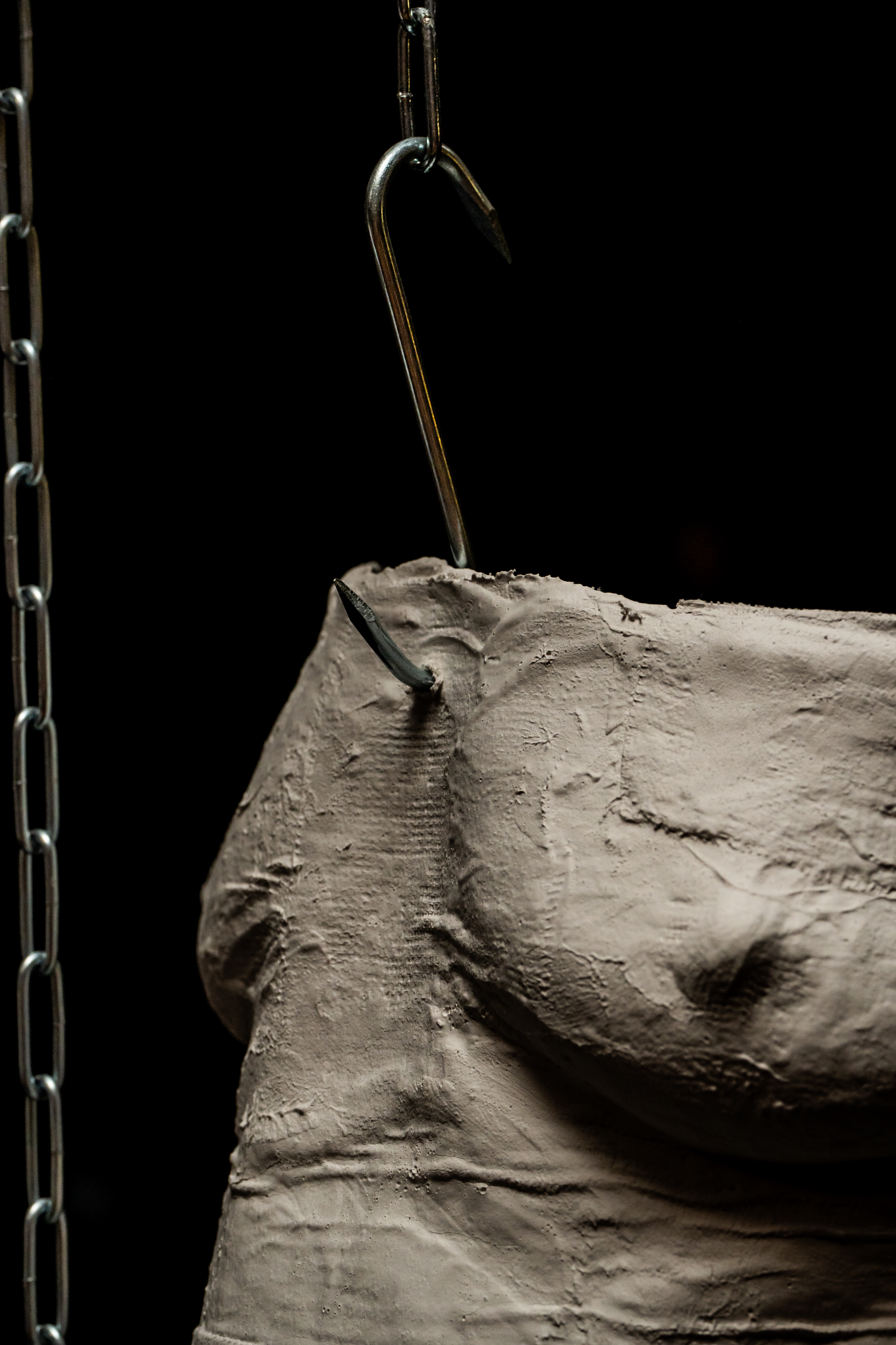 The gallery begins almost empty. By the end of the exhibtion Jenni will have spent over 50 hours in a live creative process, documenting and re-documenting her body using plaster alongside reflective writings. The casts and writings accumulate steadily, suspended by hooks and chains, questioning notions around self-perception, self-worth, time and imperfection.